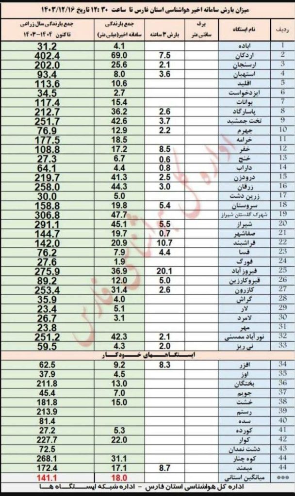 سپیدان با ۷۰ میلی متر بارش، بیشترین بارش را در سطح ایستگاه های هواشناسی استان داشته است. به گزارش شیراز۱۴۰۰، به نقل از هواشناسی فارس، در شهرک گلستان شیراز ۴۷ میلی متر و در ایستگاه فرودگاه شیراز نیز ۴۵ میلی متر بارش به ثبت رسیده است. میزان بارش باران در ایستگاه های هواشناسی استان فارس تا ساعت ۱۲:۳۰ روز ۱۶ اسفند ١۴٠٣ به شرح زیر است: