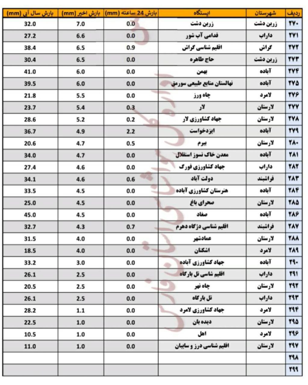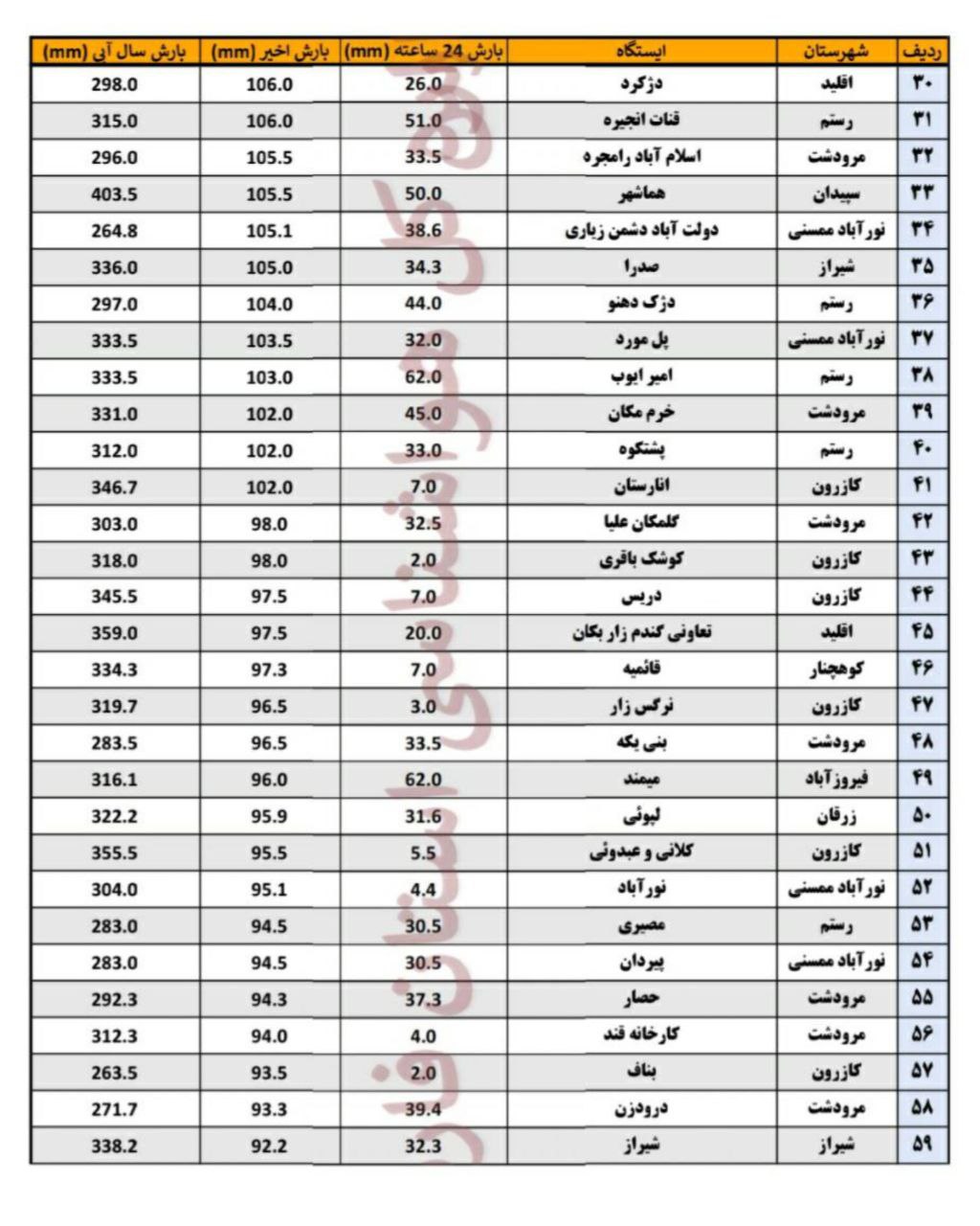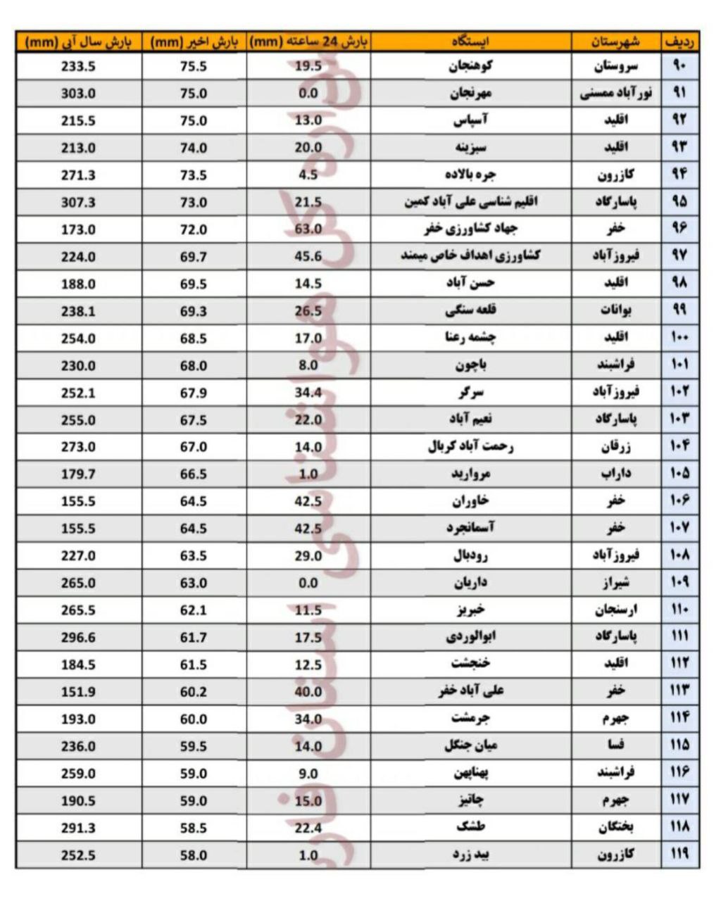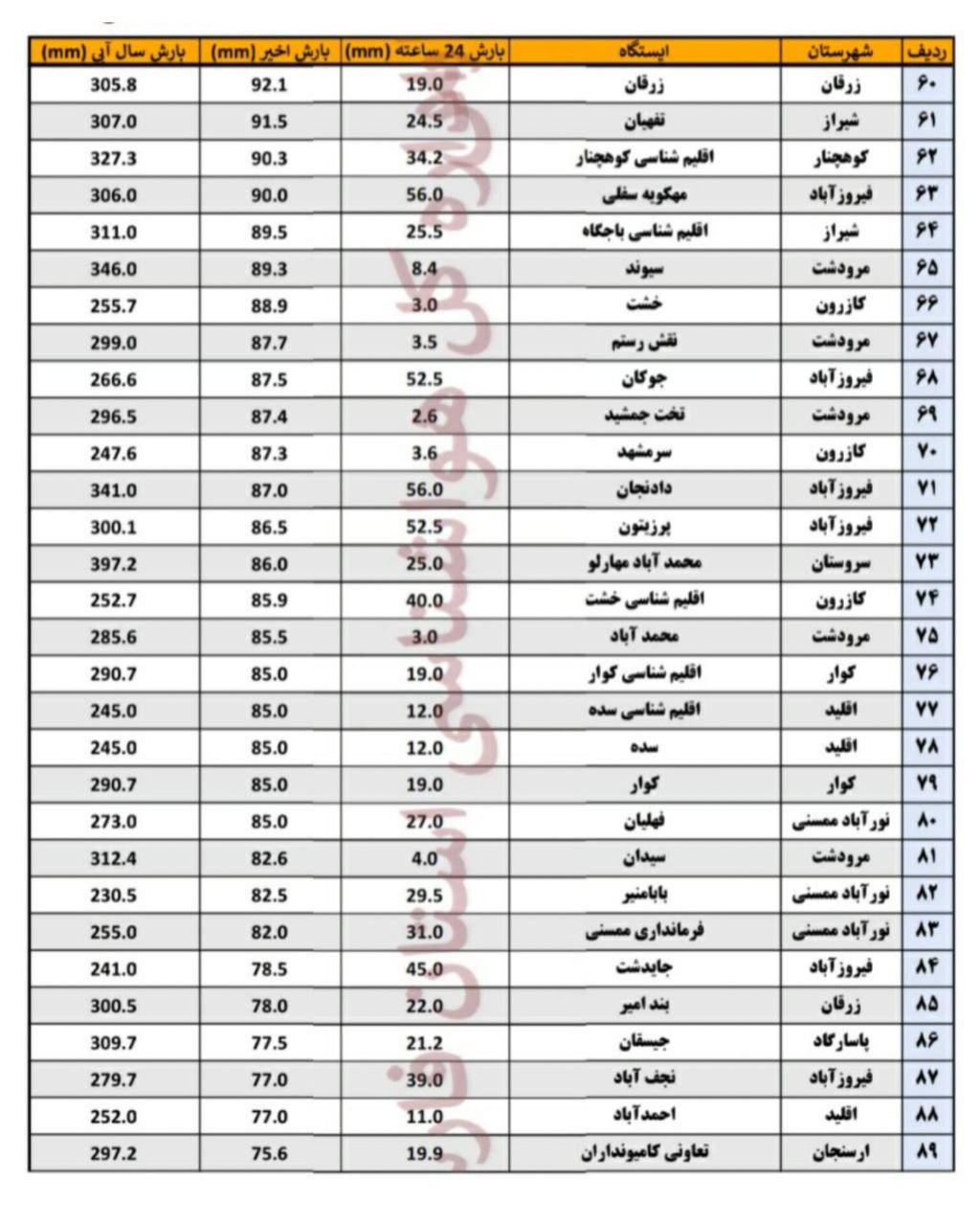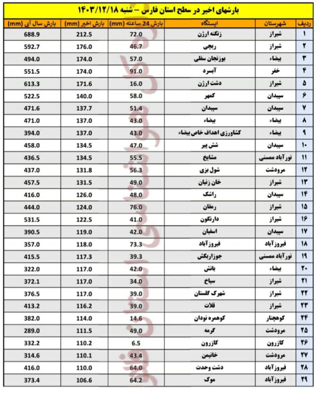 زنگنه ارژن با ۲۱۲ میلی متر بارش، بیشترین بارش را در سطح ایستگاه های هواشناسی استان داشته است. به گزارش شیراز۱۴۰۰، به نقل از هواشناسی فارس، تا ظهر امروز میزان بارش سامانه اخیر در شهرک گلستان شیراز ۱۱۷ میلی متر و در ایستگاه فرودگاه شیراز ۹۲ میلی متر ثبت شده است. میزان بارش باران سامانه اخیر در ایستگاه های هواشناسی استان فارس به شرح زیر است: