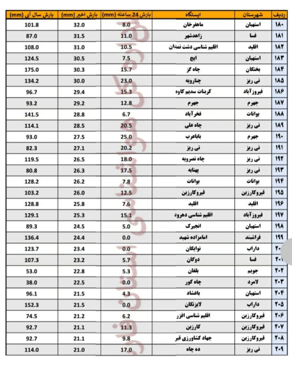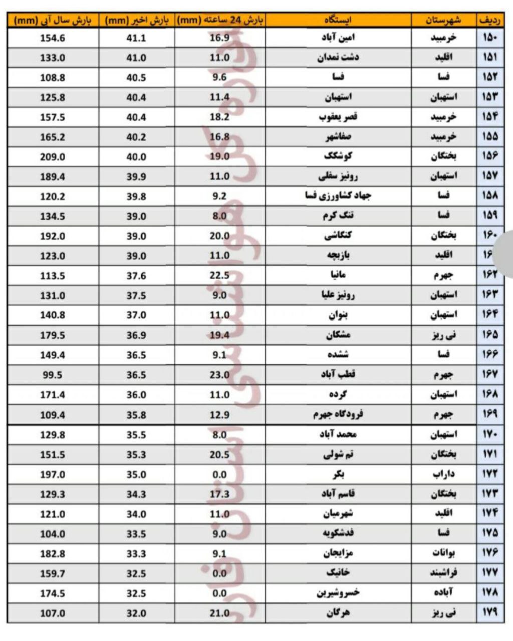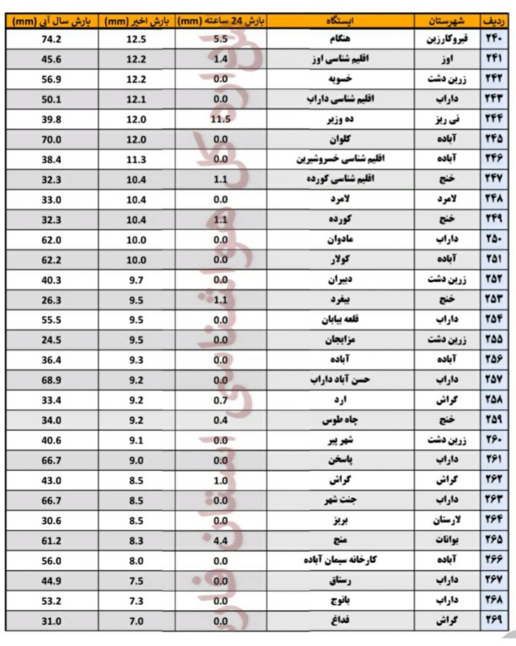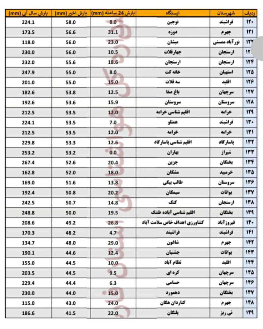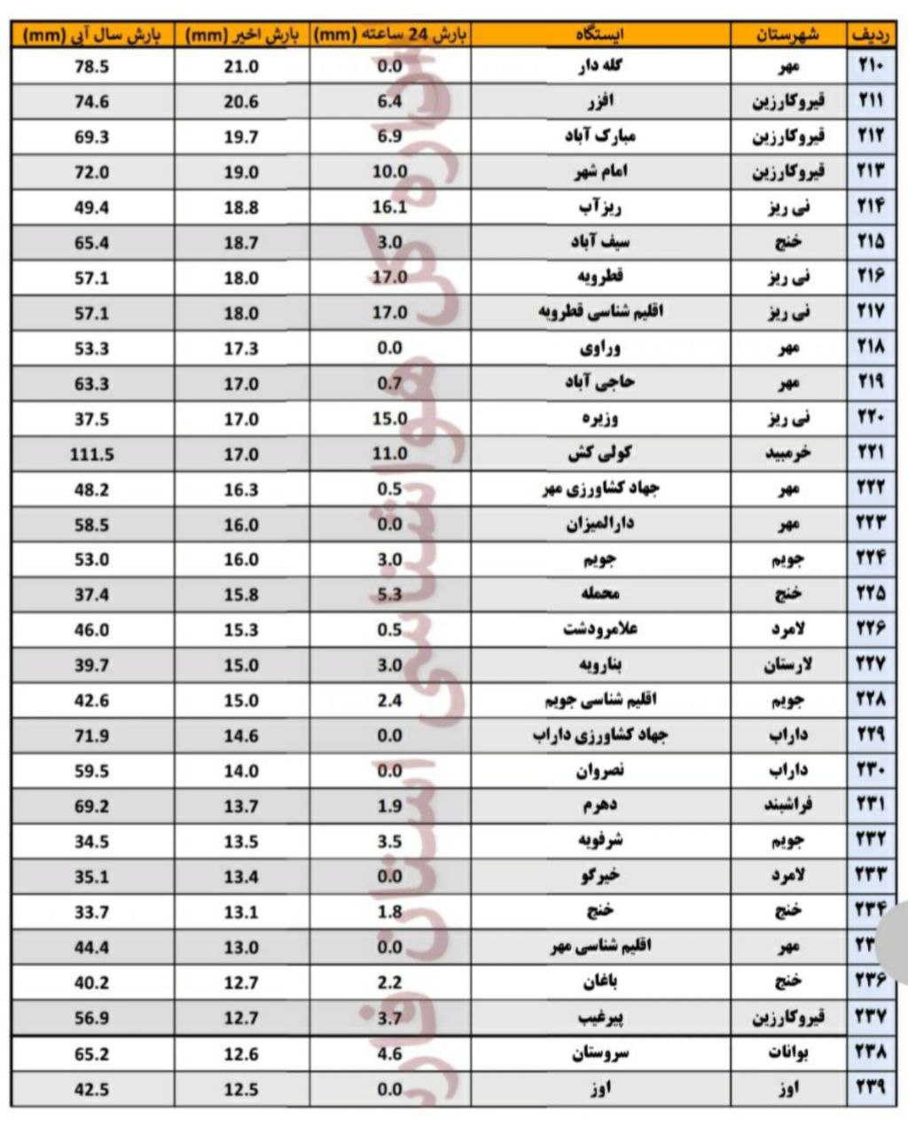 زنگنه ارژن با ۲۱۲ میلی متر بارش، بیشترین بارش را در سطح ایستگاه های هواشناسی استان داشته است. به گزارش شیراز۱۴۰۰، به نقل از هواشناسی فارس، تا ظهر امروز میزان بارش سامانه اخیر در شهرک گلستان شیراز ۱۱۷ میلی متر و در ایستگاه فرودگاه شیراز ۹۲ میلی متر ثبت شده است. میزان بارش باران سامانه اخیر در ایستگاه های هواشناسی استان فارس به شرح زیر است: