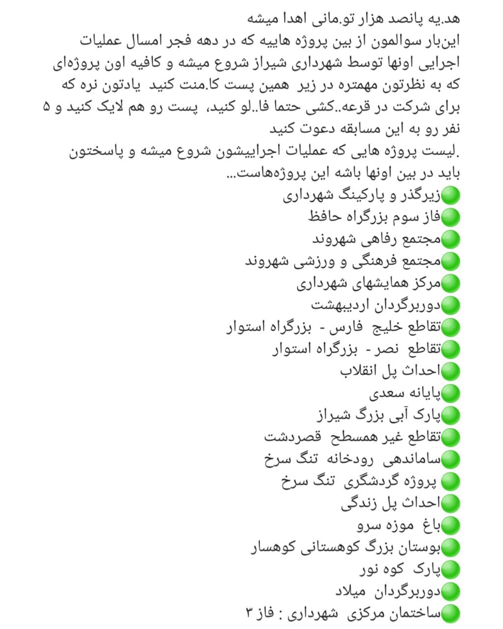 شهرداری شیراز در بهمن ماه سال ۱۴۰۲ با برگزاری یک مسابقه، فهرستی از پروژه هایی که کلنگ زنی می شود را اعلام کرد. به گزارش شیراز۱۴۰۰، شهرداری شیراز با معرفی طرح هایی که در بهمن ۱۴۰۲ کلنگ زنی می شود از مخاطبان خود خواسته بود برای شرکت در مسابقه، اسم یکی از پروژه ها را به عنوان نظر، ثبت کنند تا در قرعه کشی شرکت داده شوند. حال در روزهای پایانی سال ۱۴۰۳ مروری می کنیم بر آخرین وضعیت این طرح ها