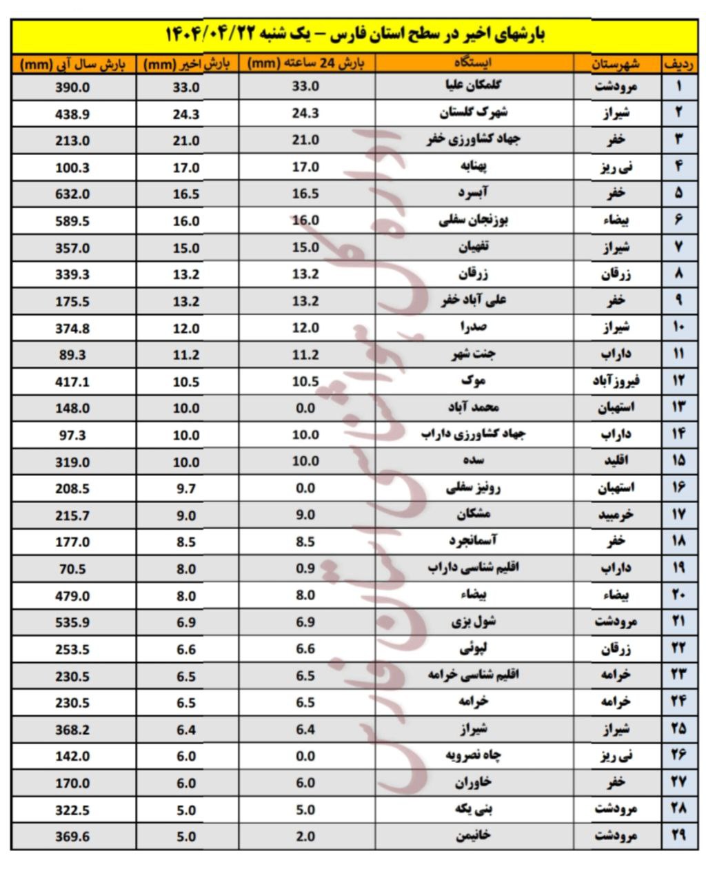 ایستگاه گلمکان مرودشت با ۳۳ میلی متر، بیشترین بارش را در بین ایستگاه های هواشناسی استان داشته است. به گزارش شیراز۱۴۰۰، میزان بارش سامانه اخیر در شهرک گلستان شیراز ۲۴ میلی متر گزارش شده است که رتبه دوم را در بین ایستگاه های باران سنجی استان داشته است. در صدرا ۱۲ میلی متر و در ایستگاه فرودگاه شیراز نیز ۶ میلی متر بارش ثبت شده است.