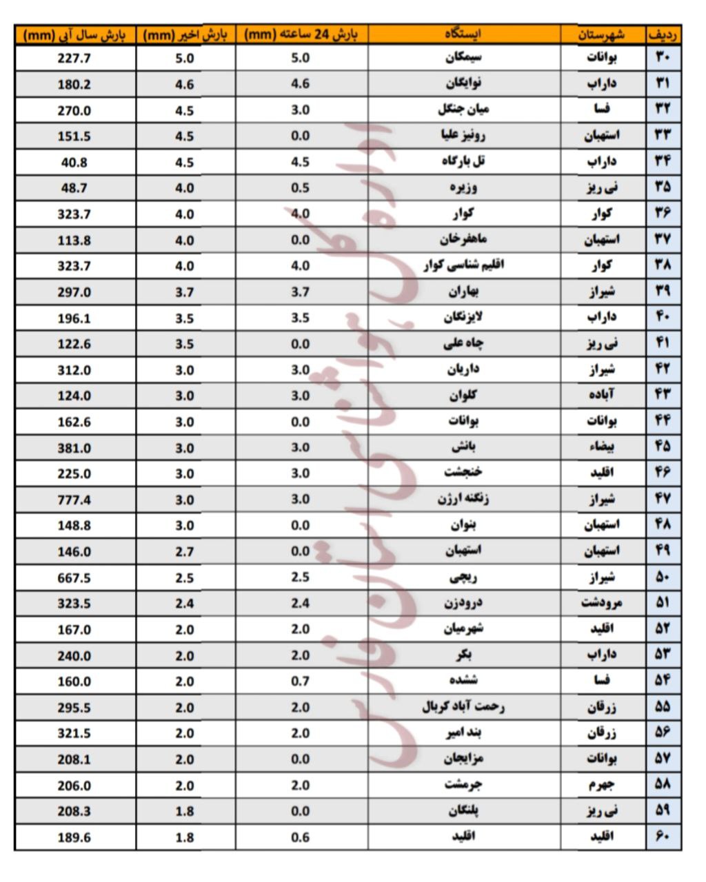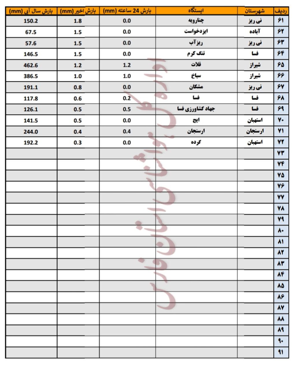 جدول آمار بارش شیراز و شهرهای فارس تا روز یکشنبه ۲۲ تیر: