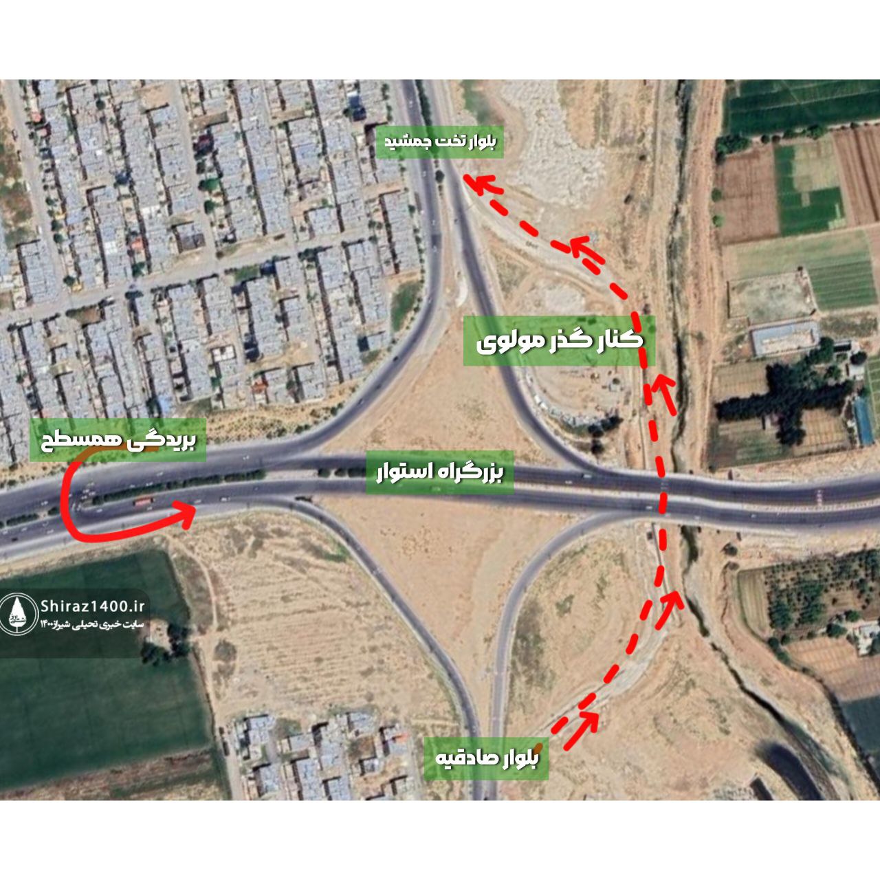 به گزارش شیراز۱۴۰۰، این کنار گذر که برای عبور عرضی از بزرگراه استوار ساخته شده است از زیر پل رودخانه خشک عبور می کند و بلوار تخت جمشید را به بلوار صادقیه متصل می کند. اما ایراد مهم این طرح یک طرفه بودن آن است و صرفا مسیر شرق به غرب را پوشش می دهد و برای مسیر مقابل همچنان باید از بریدگی همسطح بزرگراه استوار دور زد!