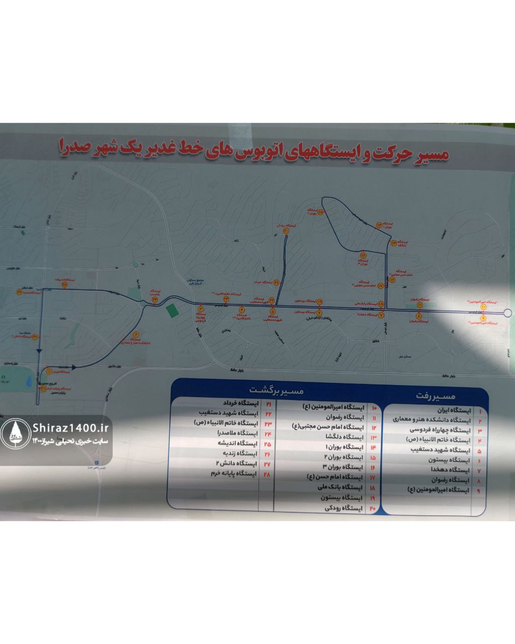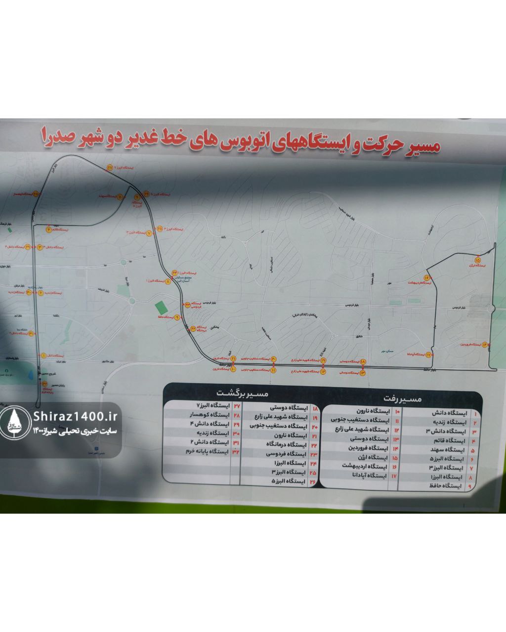 به گزارش شیراز۱۴۰۰، مسیر و ایستگاههای اتوبوس در خطوط غدیر یک و غدیر دو در شرق شهر صدرا اعلام شد. بر اساس برنامهریزی انجام شده، اتوبوسها طبق مسیرهای مشخص شده در تصاویر زیر، شهروندان را جابهجا خواهند کرد. به گفته شهردار صدرا این اقدام در راستای تسهیل تردد ساکنان و ارتقای خدمات حملونقل عمومی در صدرا صورت گرفته است.