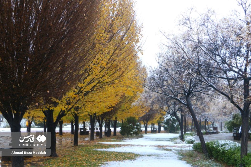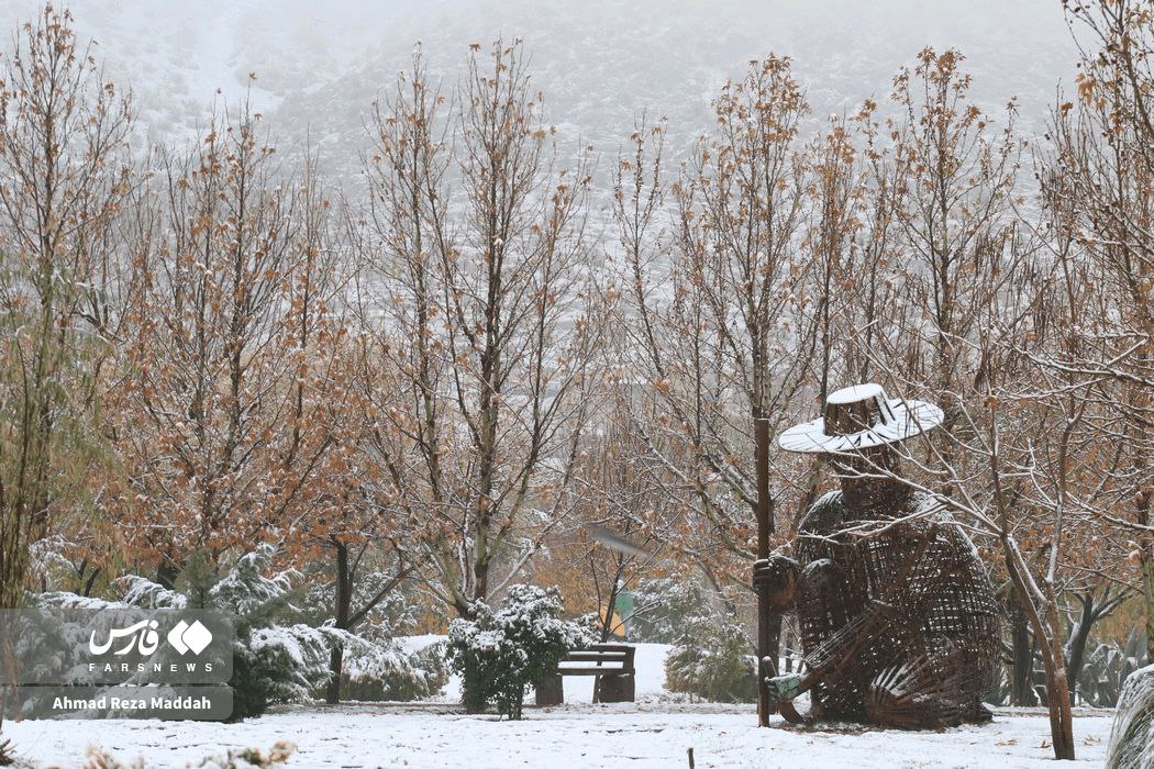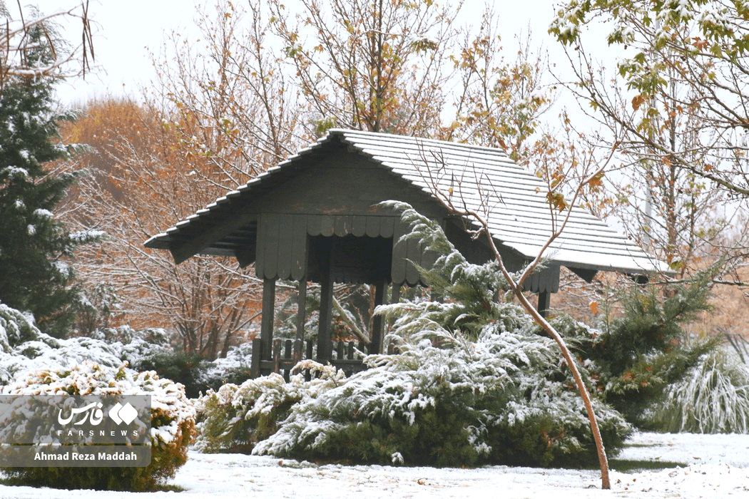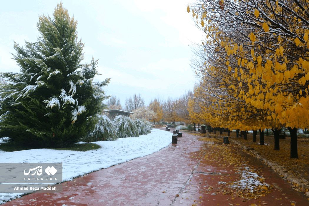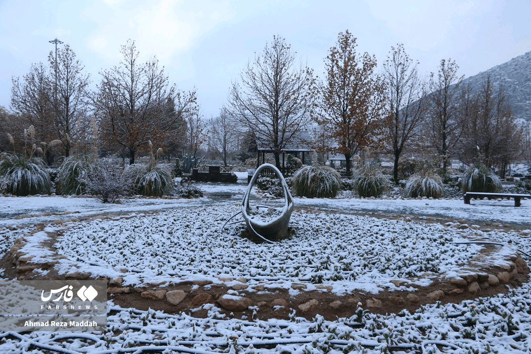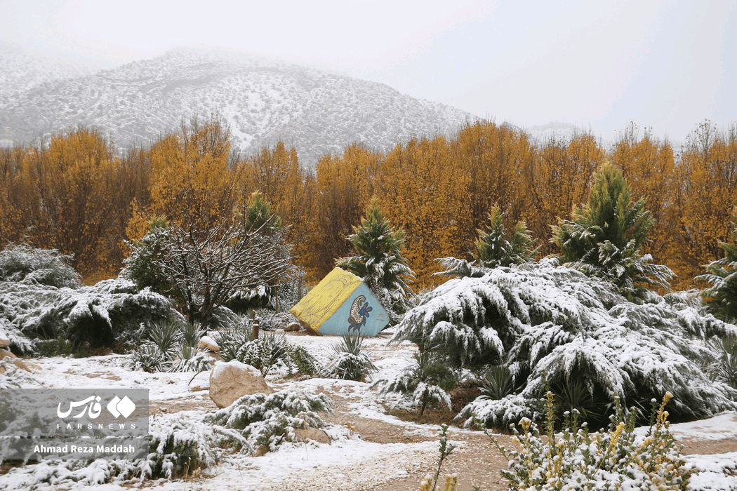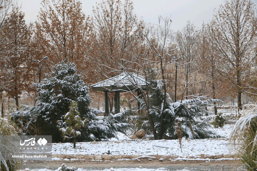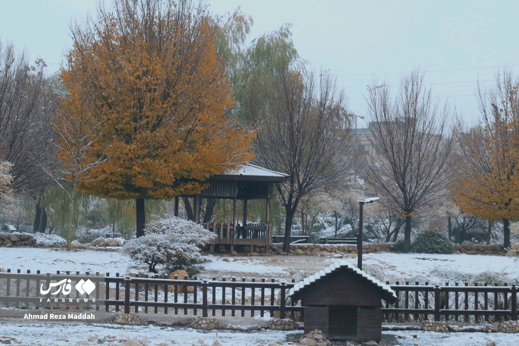 بارش برف در واپسین روزهای پاییز، اکوپارک شهر صدرا را سفیدپوش و چهرهای زمستانی به طبیعت این پارک بخشید.