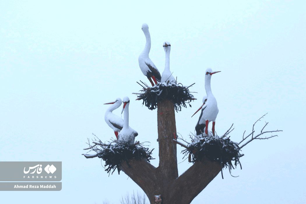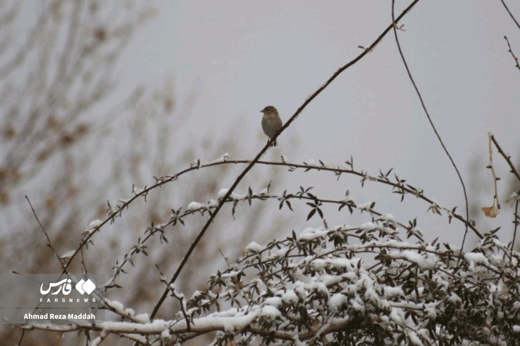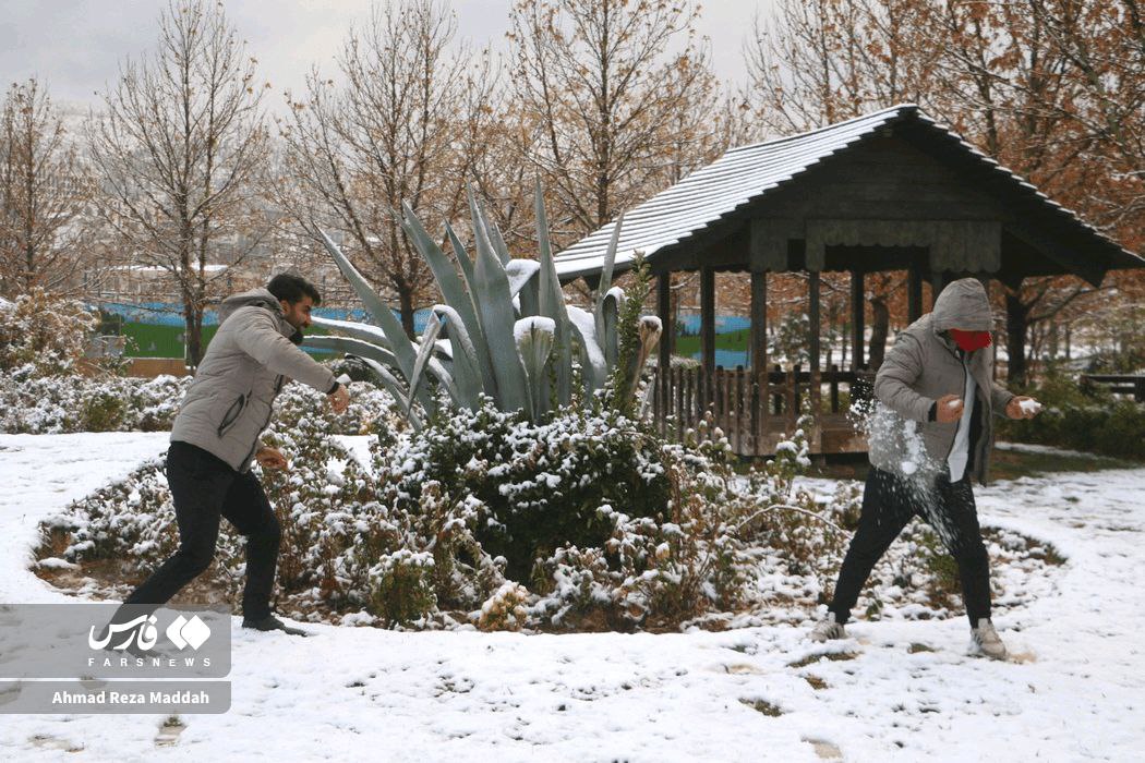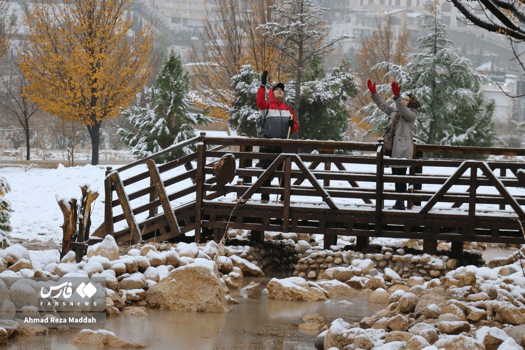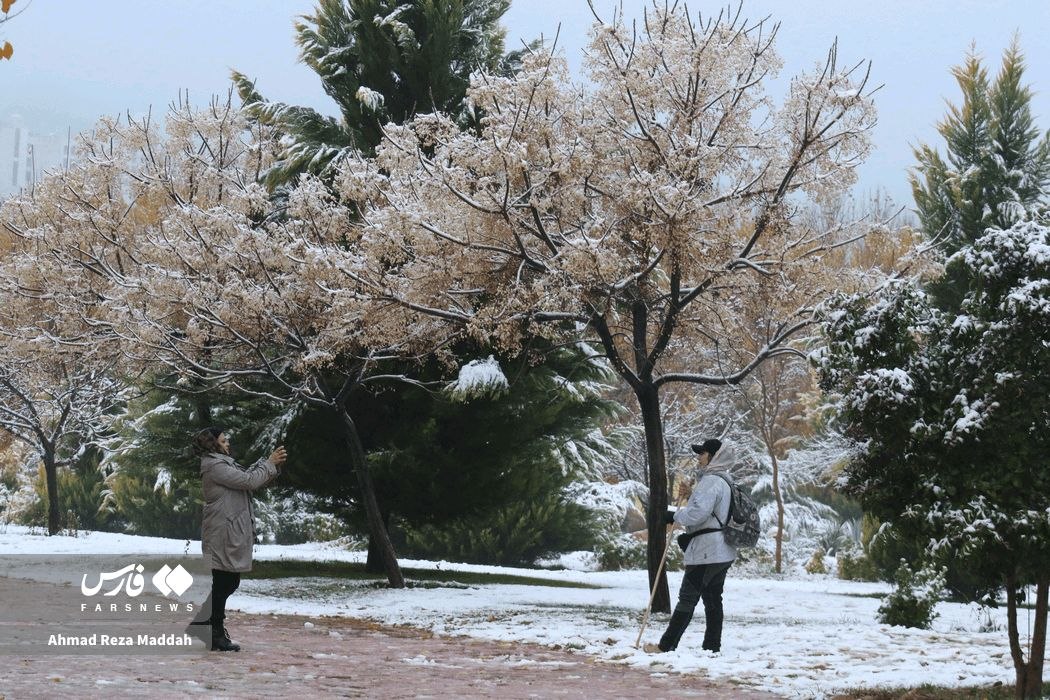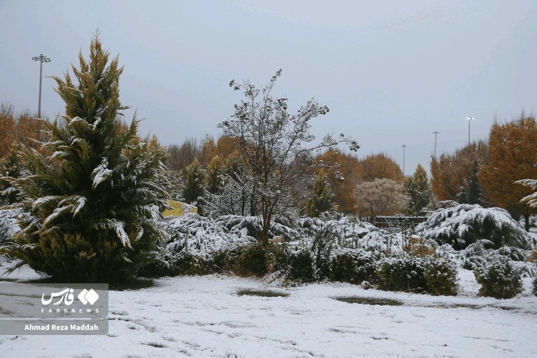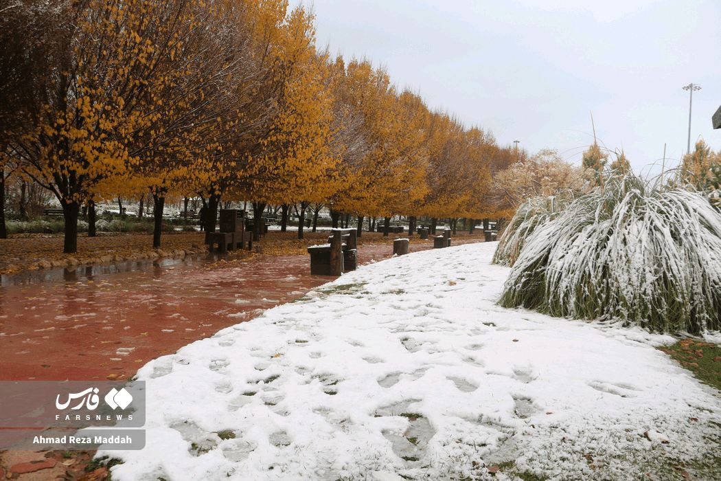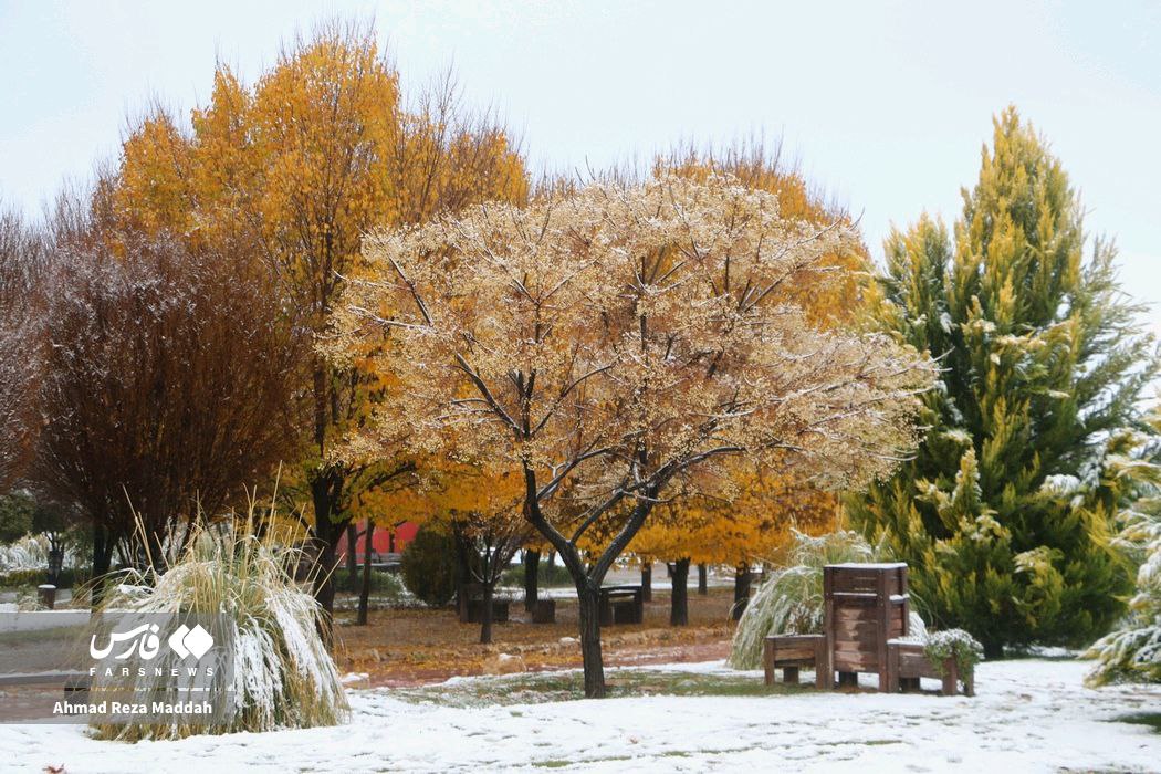 بارش برف در واپسین روزهای پاییز، اکوپارک شهر صدرا را سفیدپوش و چهرهای زمستانی به طبیعت این پارک بخشید.